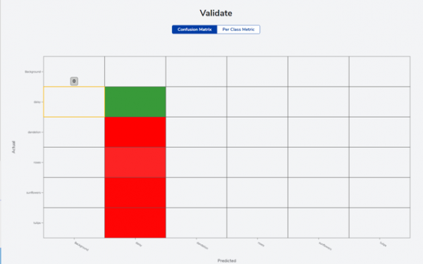 この画面では,AIモデルがどのくらいの確率で各ラベルをクラス分けできるかどうかを確認できますが,十分な精度が出ていません.必要に応じて再学習を実施します.