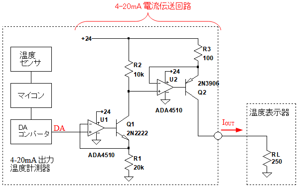 4-20mA電流伝送回路は,OPアンプを使用した非反転増幅回路と,トランジスタで構成している.