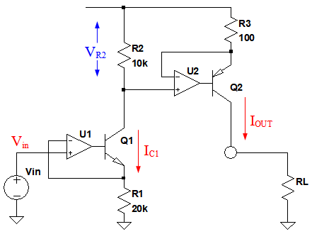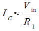 OPアンプ(U1)は,ゲイン1の非反転増幅回路として動作し,トランジスタ(Q1)のエミッタ電圧をVinと等しくします.そのため「VE=Vin」となります.そして抵抗(R1)に流れる電流は,ベース電流を無視するとQ1のコレクタ電流(IC)と等しく,図4のICは,式3で表されます.