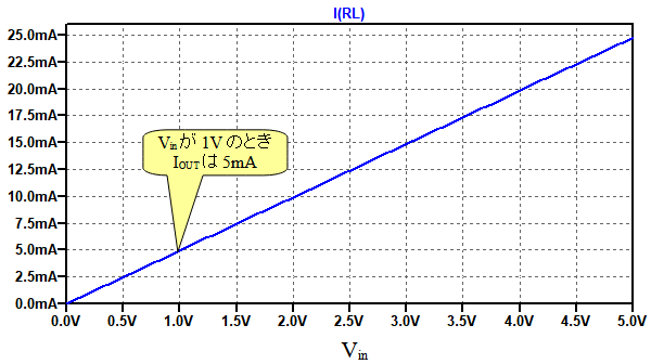 図8は,図7のシミュレーション結果です.RLの電流(IOUT)をプロットしています.Vinが0V~5Vまで変化すると,IOUTは0~25mAまで変化し,Vinが1Vのとき,IOUTは5mAとなっていることが分かります.
