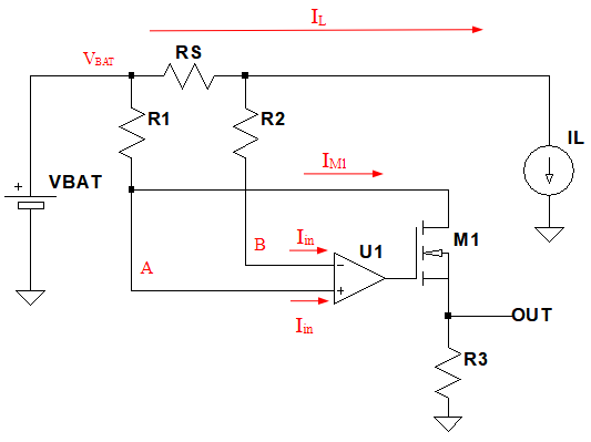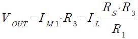 OPアンプ(U1)は,非反転入力端子と反転入力端子の電圧が等しくなるように,M1の電流をコントロールします.その結果,M1の電流(IM1)は「IM1=IL×RS/R1」となります.OUT端子の電圧(VOUT)はIM1とR3を掛けたもので,次式となり,0.5Vとなります.