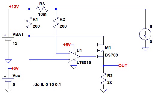 図3は,OPアンプとMOSFETで構成した電流電圧変換回路をシミュレーションするための回路です.使用しているOPアンプは,電源電圧よりも高い電圧が入力されても動作可能な「Over-The-Top入力段」を備えた,LT6015です.VBATの電圧は12Vで,OPアンプの電源電圧は5Vとなっています.電流源(IL)の電流を0から10Aまで0.1Aステップで変化させるシミュレーションを行います.