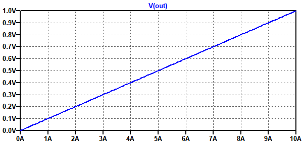 図4は,図3のシミュレーション結果です.OUT端子の電圧はILに比例して増加し,ILが5Aのときに0.5Vとなっています.図3の回路は,RSに流れる電流を,GND基準の電圧に,正確に変換できていることが分かります.