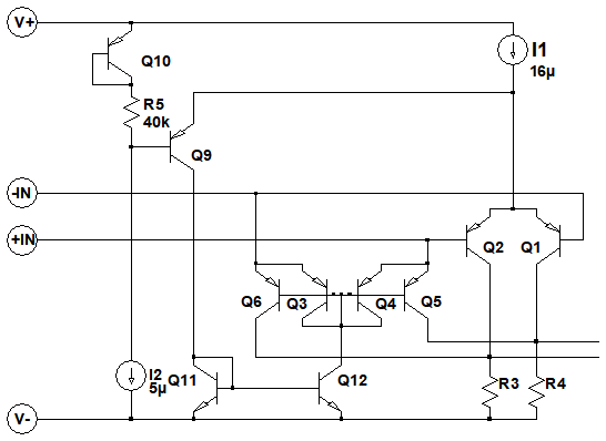 入力同相電圧が,OPアンプの「[V+]電圧-1.5V」以上になると,電流源(I1)の電流は,Q9を経由し,Q11,Q12のカレントミラー回路に流れます.すると,Q3~Q6のエミッタ入力差動回路がアクティブになり,Q1,Q2に替わって動作します.Q3~Q6のエミッタ入力差動回路は,入力同相電圧がOPアンプの電源電圧よりも高くても動作することが可能です.