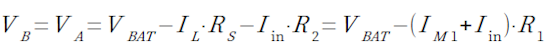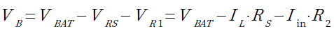 ・・・・・・・・・・・・・・・・・・・・・・・・・・・・・・・(1)OPアンプの入力バイアス電流をIinとすると,B点の電圧(VB)は電源(VBAT)からRSとR2の電圧降下を引いたものなので,式2で表されます.