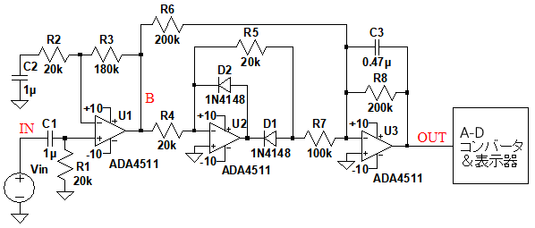 図1のOPアンプ(U1)は,非反転増幅回路となっています.また,OPアンプ(U2,U3)は,ダイオード(D1,D2)と全波整流回路を構成しています.コンデンサ(C3)は,全波整流波の交流成分を平滑するためのものです.そのため,OUT端子には全波整流波の平均値が出力されます.